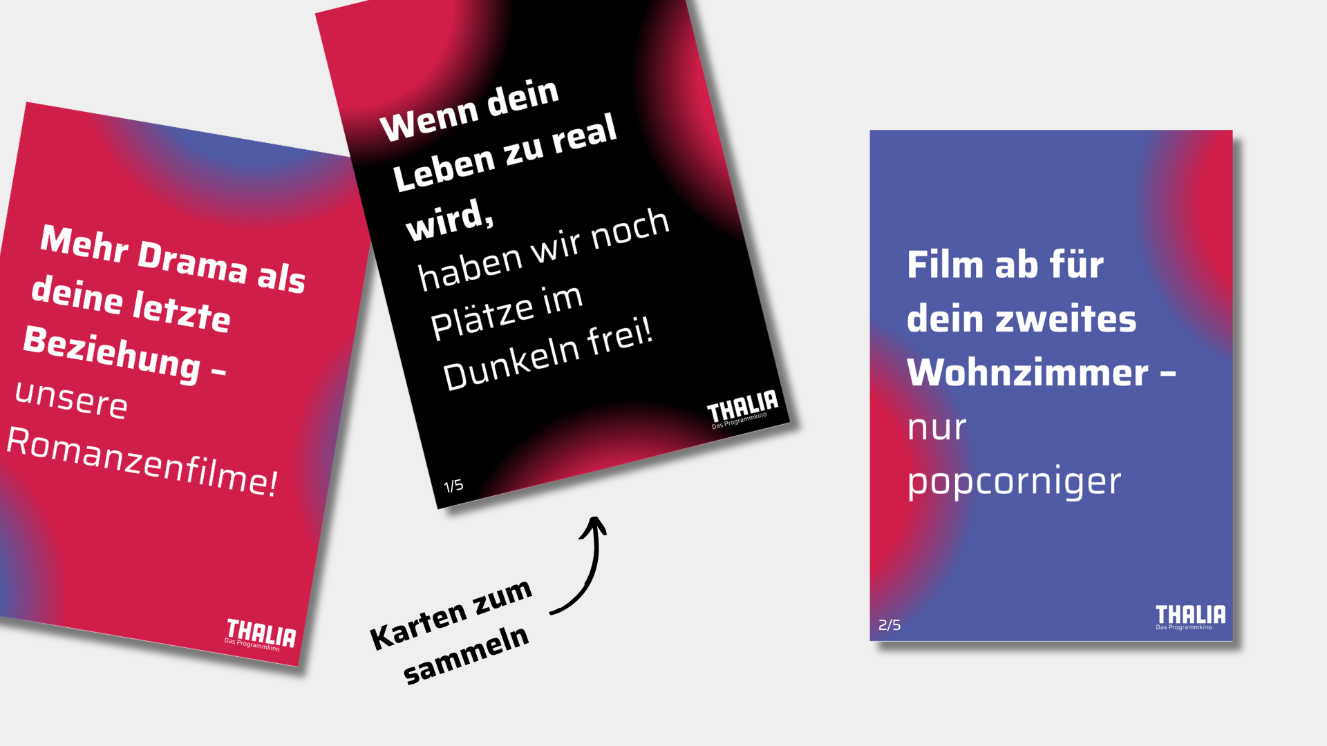 Neben digitalen Anwendungen entstand eine Markenästhetik, die das Thalia Kino als kulturellen Ort positioniert: unabhängig, cineastisch und nahbar. Die Gestaltung vermittelt Haltung – nicht über Lautstärke, sondern über Präzision, Atmosphäre und Wiedererkennbarkeit.